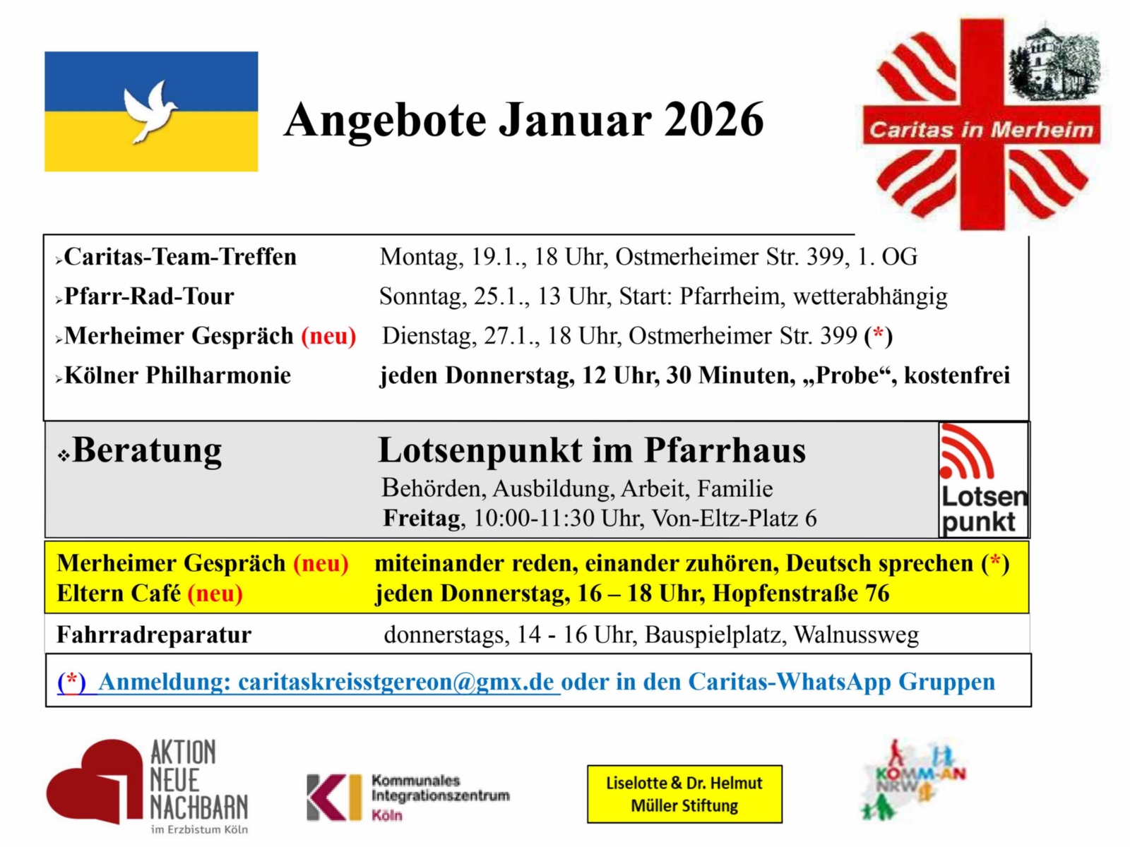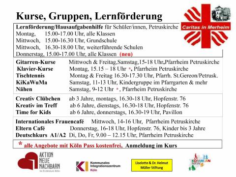 Ob Basteln, Vorlesen, Hausaufgabenbetreuung, Frauenfrühstück oder Single-Treff – die ehrenamtlichen und professionellen Helfer freuen sich über jeden, der mal vorbeischaut, regelmäßig mitmacht oder Rat sucht. Willkommen sind auch Bürger aus den angrenzenden Ortsteilen. Ergänzend bieten sich auch die Angebote des Bauspielplatz Merheim BKMG an.