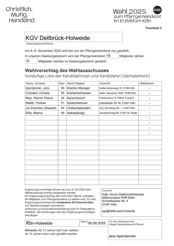 Für die Erstkommunionvor-bereitung 2026 in Holweide und Dellbrück werden Katecheten oder Katechetinnen gesucht, die sich bereiterklären, eine Erstkommu-niongruppe auf ihrem Weg zu begleiten. Sollten Sie daran Interesse haben, melden Sie sich bitte - so bald wie möglich - bei Frau Odendahl, Tel. 6808767, d.odendahl@dellbrueck-holweide.de