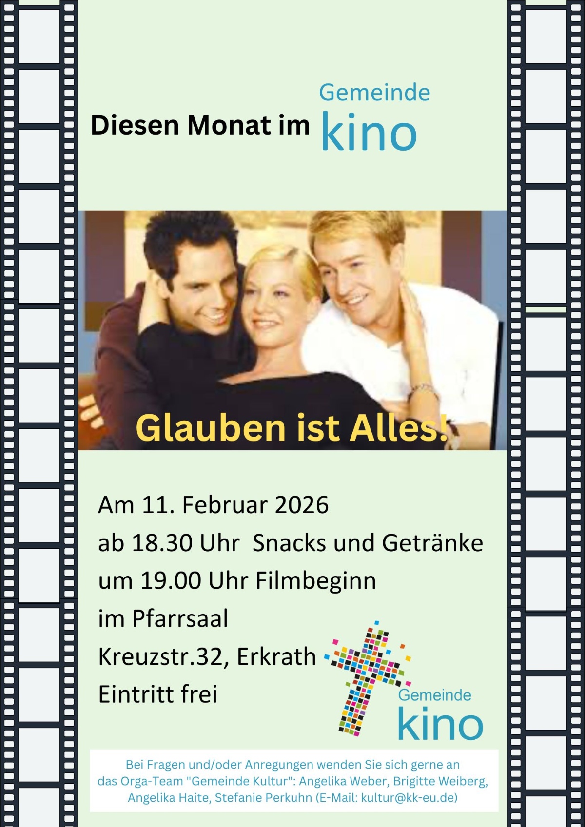 Am Donnerstag, Mittwoch, 11. Februar um 19 Uhr wird im Pfarrsaal die romantische Komödie: „Glauben ist alles“ von Edward Norton gezeigt. Einlass ab 18:30 Uhr mit Snacks & Getränken, der Eintritt ist frei.