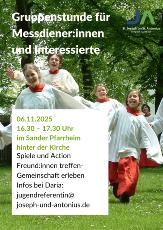 Ab dem 6.11.2025 findet alle zwei Wochen eine Messdiener:innengruppe statt, zu der auch alle Interessierten eingeladen sind.
