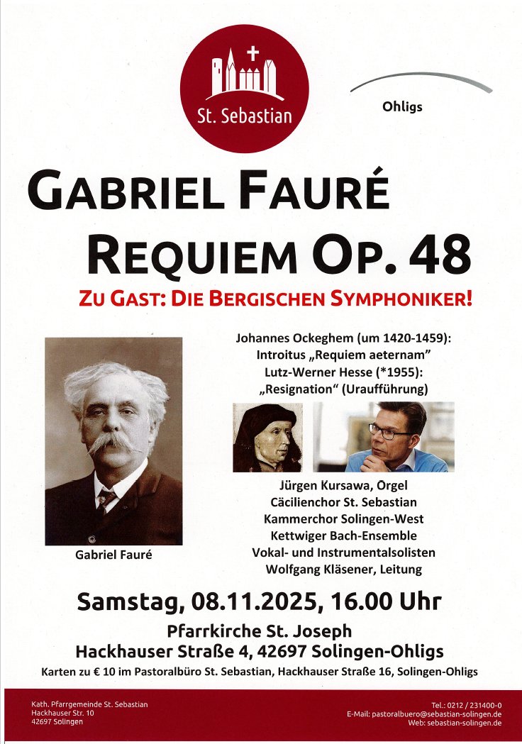Das Hauptwerk des Abends aber bildet das Requiem Op. 48 des französischen Komponisten Gabriel Fauré. Ganz von christlicher Hoffnung geprägt, stimmt es kein Jüngstes Gericht an, vielmehr stehen Klänge von sanfter Farbgebung im Vordergrund, unterstützt durch den Zusammenklang der Bergischen Symphoniker mit der Chororgel der Firma Flentrop, gespielt von Jürgen Kursawa, der an der Robert-Schumann-Hochschule in Düsseldorf lehrt. Die Leitung hat Wolfgang Kläsener.