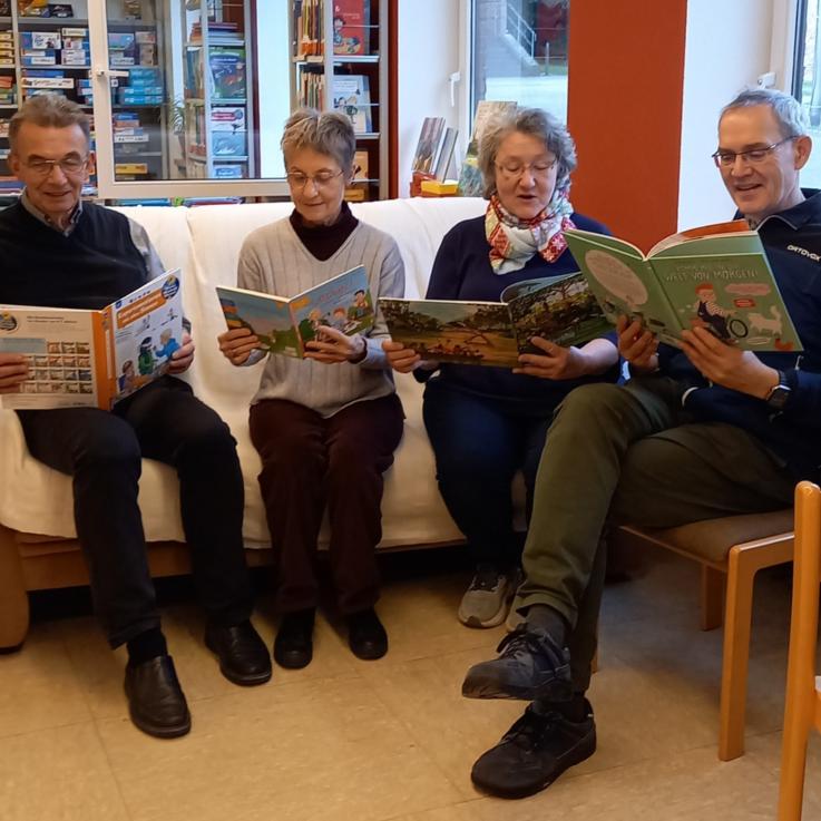 und da haben doch schon einige gleich Spaß beim Stöbern. Foto: v.l.n.r. Hans-Peter Lawrenz (LA), Doris Golbach (Bücherei), Anette Göhler (Bücherei), Stephan Schreckenberg (LA)