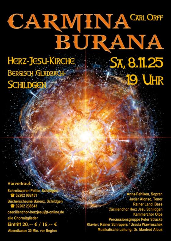 Der Cäcilienchor Herz Jesu führt am Samstag, 8. November 2025 um 19:00 Uhr gemeinsam mit dem Kammerchor Olpe und den Solisten Anna Pehlken (Sopran), Javier Alonso (Tenor), Rainer Land (Bass), sowie der Perkussionsgruppe Peter Stracke die Carmina Burana von Carl Orff auf.