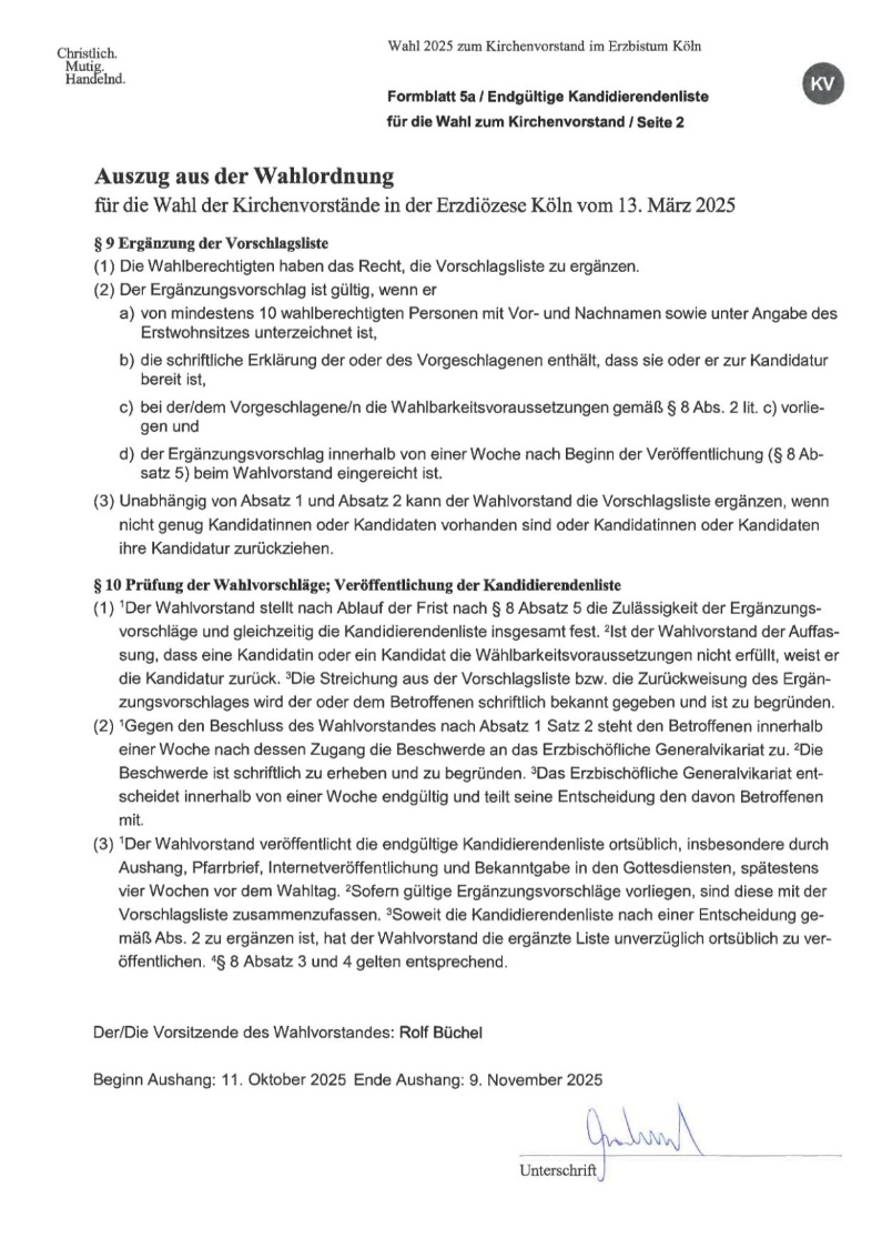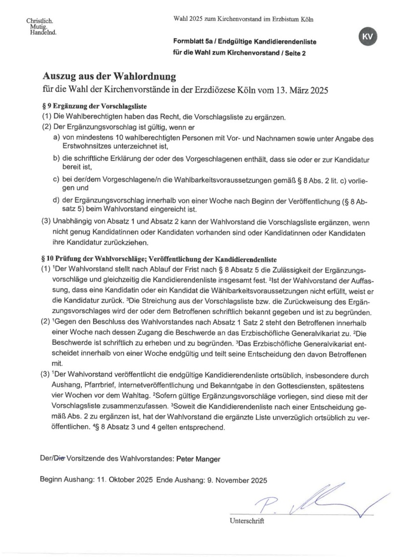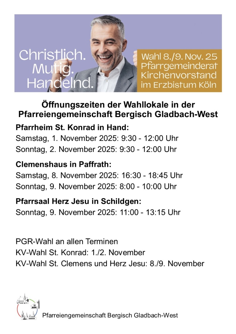Am 1./2. und 8./9. November wählen wir für die Pfarreiengemeinschaft Bergisch Gladbach-West (Hand, Paffrath und Schildgen) die neuen Mitglieder für den Pfarrgemeinderat und den Kirchenvorstand.