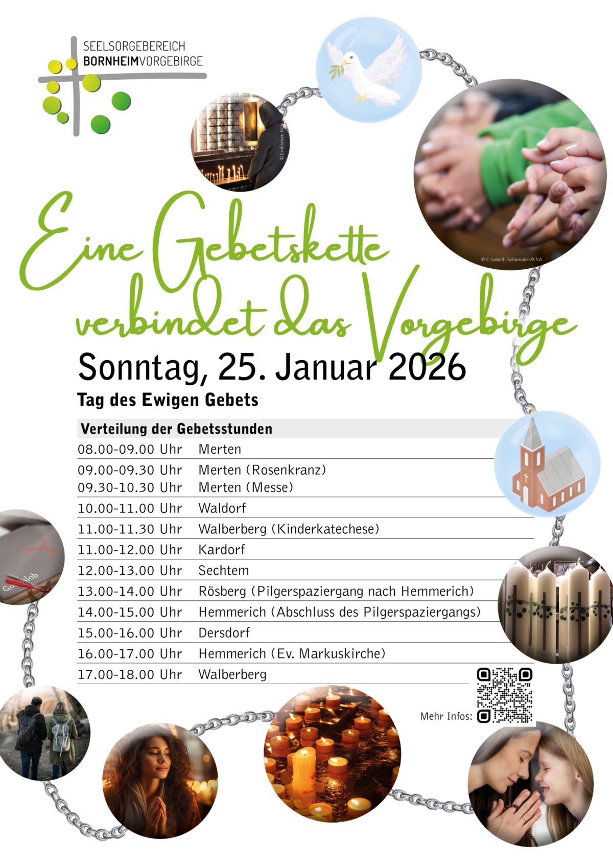Unter dem Motto „Eine Gebetskette verbindet das Vorgebirge“ laden alle acht Liturgieausschüsse zum gemeinsamen Ewigen Gebet im Seelsorgebereich Bornheim-Vorgebirge am Sonntag, 25. Januar ein. Der Gebetstag ist als Gebetsstafette organisiert und steht unter dem Thema „Siehe, ich mache alles neu.“ Die Gebetsstunde in Sechtem findet von 12 bis 13 Uhr in der Pfarrkirche statt. Die Liste der Gebetsstunden im Seelsorgebereich finden Sie hier und Hinweise zu den Pilgerspaziergängen hier.
