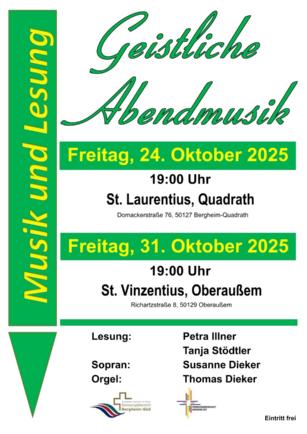 Die 27. „Geistliche Abendmusik“ findet am Freitag, dem 31. Oktober um 19 Uhr in der Pfarrkirche St. Vinzentius in der Richartzstr. 8 in Bergheim-Oberaußem statt. Die Sopranistin Susanne Dieker ist auch hier als Gast geladen. Frau Tanja Stödtler liest zum Thema „Maria“.