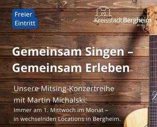 Am Mittwoch, den 5. November 2025, 16.00 Uhr – 17.00 Uhr, wird im Pfarrheim in Ahe, neben der Katholischen Kirche, ein „Mitsing-Konzert“ angeboten. Der Gitarre spielende Martin Michalski lädt ein, Lieder in Gemeinschaft mit ihm zu singen. Der Eintritt ist frei. Veranstalterin ist die Stadt Bergheim. Eingeladen ist jeder Mensch, der Lust am gemeinsamen Singen hat und für eine gute Stunde einmal auf andere Gedanken kommen möchte